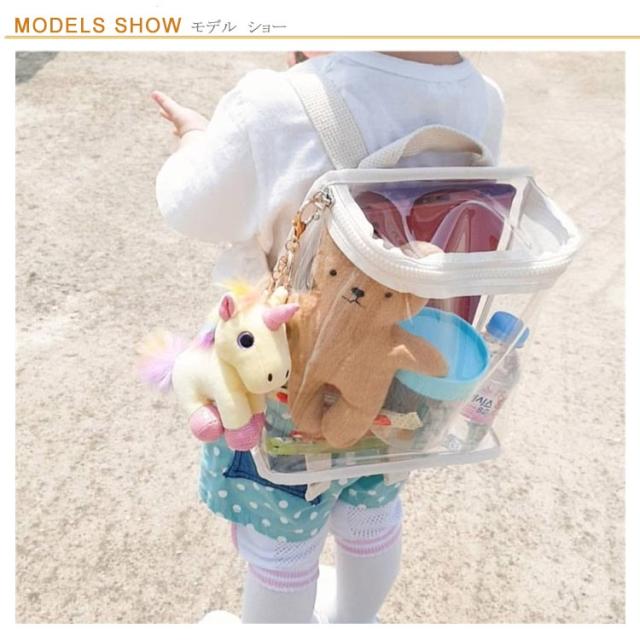 | 見える可愛いさ!夏に最適キッズクリアリュック こどもたちのおでかけに、中身の見えるクリアリュックです。 水に強いPVC素材を使い、プールバッグとしてもオススメ♪ 海やプールにはもちろん、おやつをもっておでかけの時にも可愛いです。 お洒落で可愛いデザインなので夏だけではなく毎日のお出かけにもぴったり。 | |
