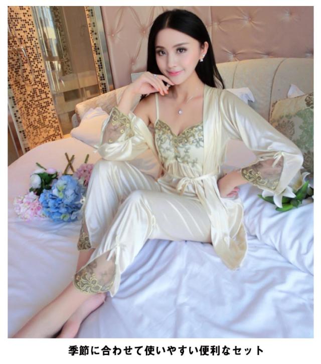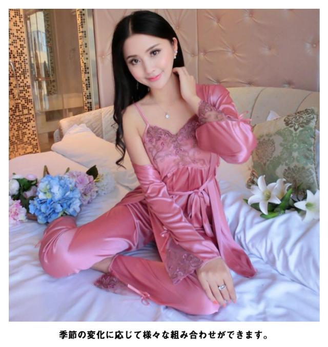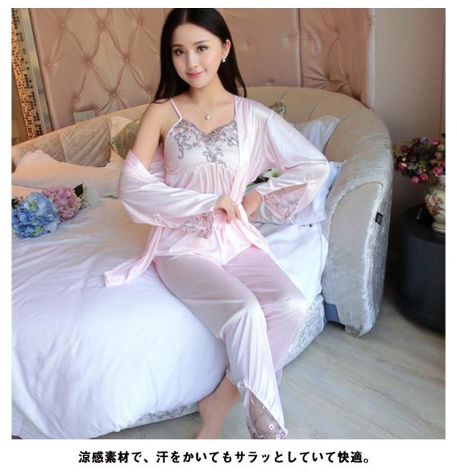 5色 パジャマセット 3点セット ルームウェア レディース ナイトウェア パジャマ サテン アイスシルク 接触冷感 シルクタッチ 3点 長ズボン キャミソール 羽織 上下セット ゆったり 夏 春 秋 大人 おしゃれ プレゼント ギフト