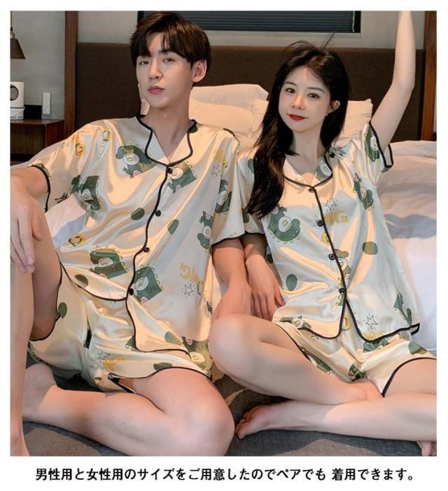 2点セット パジャマ 上下セット メンズ レディース アイスシルク 接触冷感 シルク シルクタッチ シルク調 襟付き Vネック シルク調サテン地 ペアパジャマ ルームウェア 部屋着 寝間着