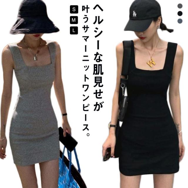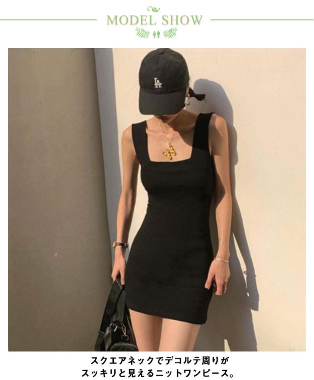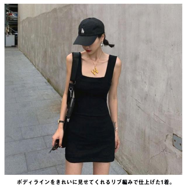 【送料無料】ミニワンピース タイト ノースリーブ スクエアネック ミニワンピ キャミワンピ タンクトップワンピ ストレンチ 韓国 大人可愛い ミニ丈 ニットワンピース タイト セクシー シンプル 白 黒 無地 春夏秋