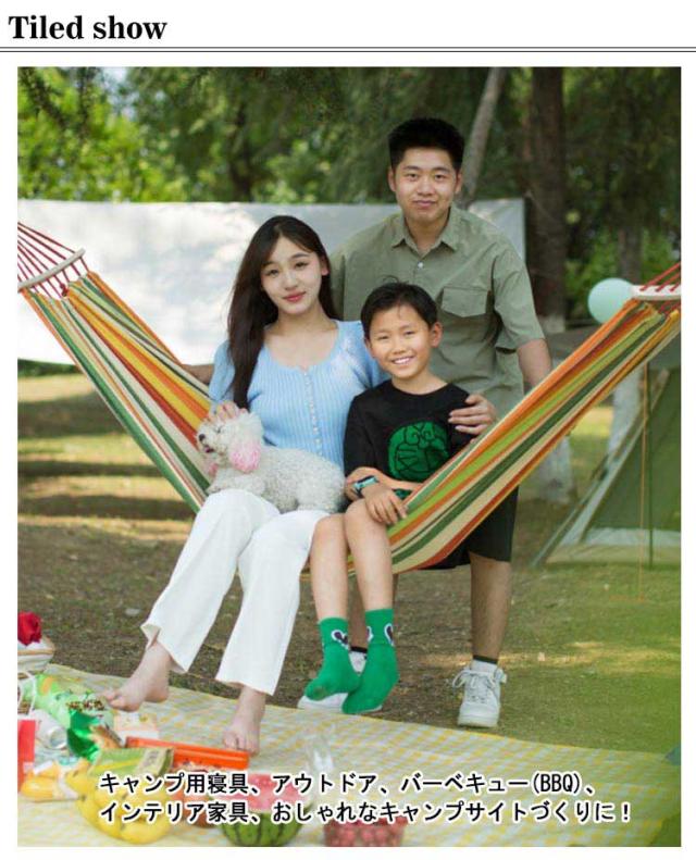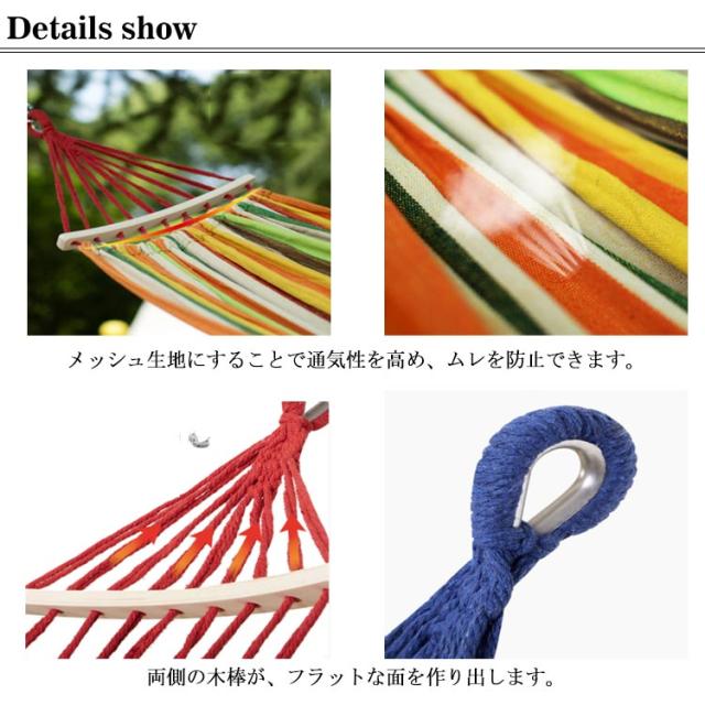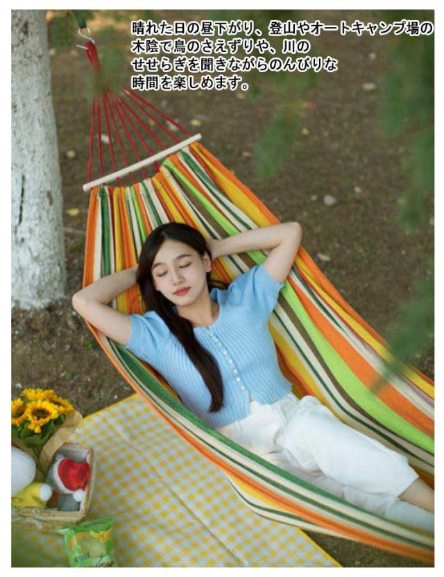| どこにでも設置できるポータブルハンモック。 数分で設置できます。軽量で収納や持ち運びが簡単。 超軽量コンパクト収納で携帯に大変便利! メッシュ生地にすることで通気性を高め、ムレを防止できます。 スペースをほとんど必要とせず、コンパクトで持ち運びに便利な、同色の収納袋が付き。 両側の木棒が、フラットな面を作り出します。 メッシュハンモックは屋内または屋外での使用に十分な用途があり、季節に応じて移動するのに非常に軽いです。 ぶら下がるのは簡単です! 折りたたみやすく、持ち運びが簡単で、軽くて支えやすい。 キャンプ用寝具、アウトドア、バーベキュー(BBQ)、インテリア家具、おしゃれなキャンプサイトづくりに!晴れた日の昼下がり、登山やオートキャンプ場の木陰で鳥のさえずりや、川のせせらぎを聞きながらのんびりな時間を楽しめます。 収納バック付き。 | |