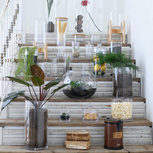 重ねたり、紐を通して上から吊り下げてアレンジしたり、日曜大工用の電動ドリルなどで穴をあけることが可能です。穴をたくさん開けて花をいっぱい活けたり、ガラスでは危なくてできなかったことが実現可能になりディスプレイの幅が広がります。