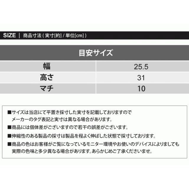 | サイズ | 実寸サイズ サイズ/幅/高さ/マチ/重量(g) F 25.5cm/31cm/10cm/450g |