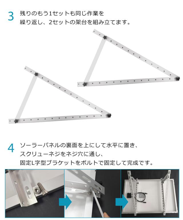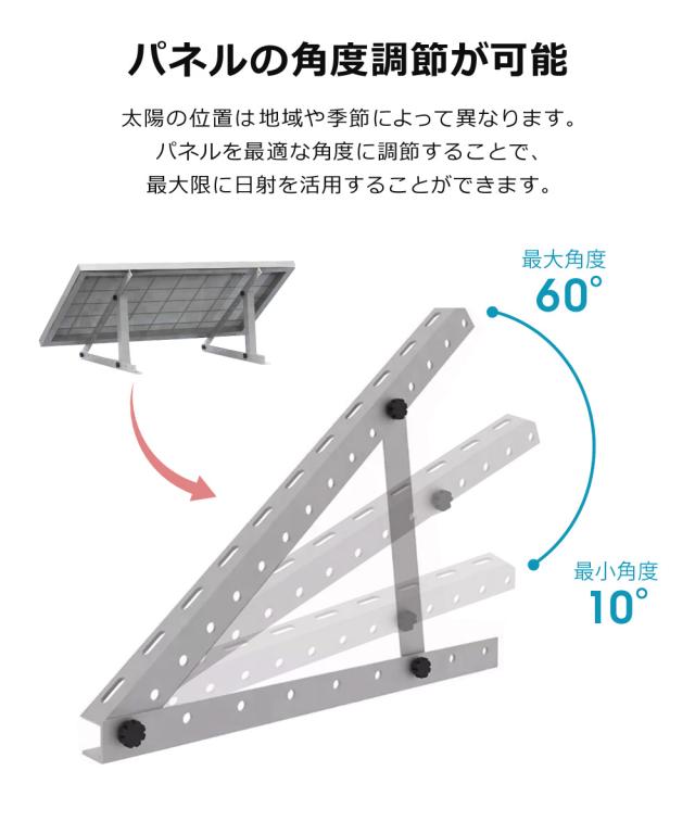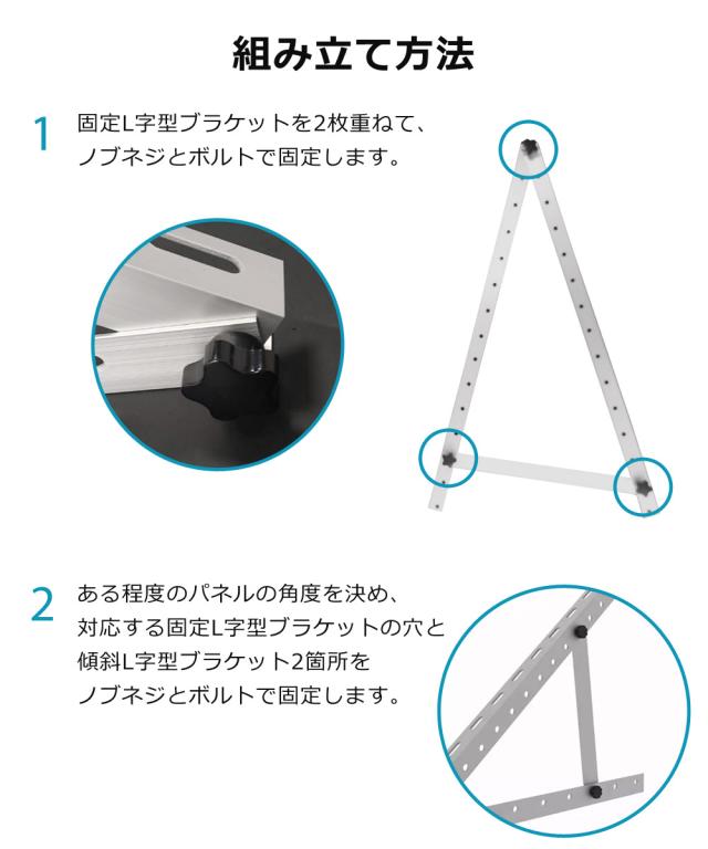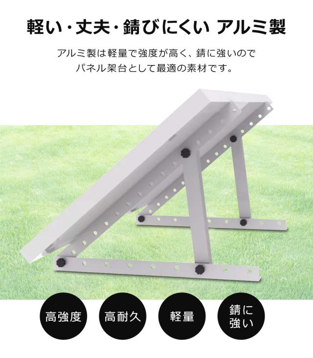 | ソーラーパネル設置架台 太陽光を効率よく受け取り、発電量をUP! パネルの角度調節が可能 太陽の位置は地域や季節によって異なります。 パネルを最適な角度に調節することで、 最大限に日射を活用することができます。 幅100〜200cmのパネルに対応 幅100〜200cmのソーラーパネルを取付可能です。 固定L字型ブラケットのパネル取付穴を全面に配置し、汎用性を高めています。 軽い・丈夫・錆びにくい アルミ製 アルミ製は軽量で強度が高く、錆に強いので パネル架台として最適の素材です。 組み立て方法 1.固定L字型ブラケットを2枚重ねて、ノブネジとボルトで固定します。 2.ある程度のパネルの角度を決め、対応する固定L字型ブラケットの穴と 傾斜L字型ブラケット2箇所をノブネジとボルトで固定します。 3.残りのもう1セットも同じ作業を繰り返し、2セットの架台を組み立てます。 4.ソーラーパネルの裏面を上にして水平に置き、スクリューネジをネジ穴に通し、 固定L字型ブラケットをボルトで固定して完成です。 | ||||||||||