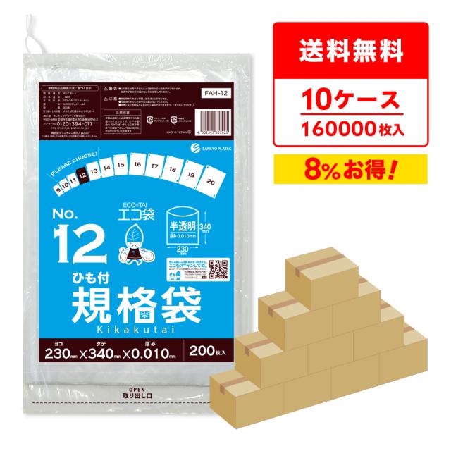 【まとめて10ケース】FAH-12-10 ひも付 規格袋 12号 0.010mm厚 半透明 200枚x80冊x10箱 食品検査適合 RoHS指定 送料無料