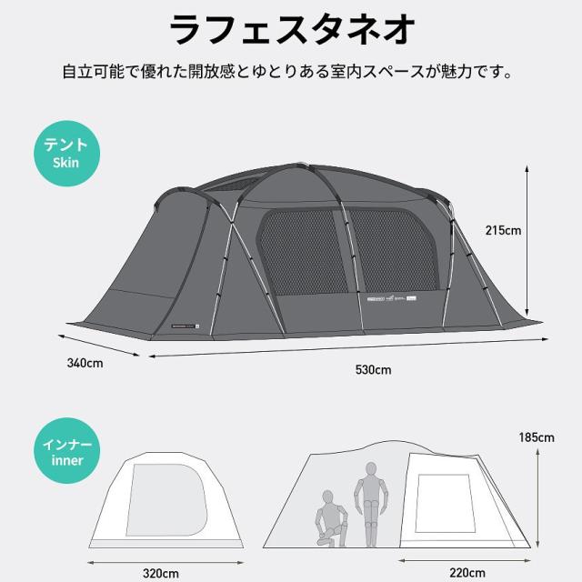 サイズ:使用時 530×340×(h)215cm / 収納時 80×32×32cm / インナーテント 320(250)×220×(h)185cm