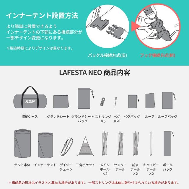 内容:テント本体、インナーテント、ループ、グランドシート、三角ポケット、デイジーチェーン、収納ケース