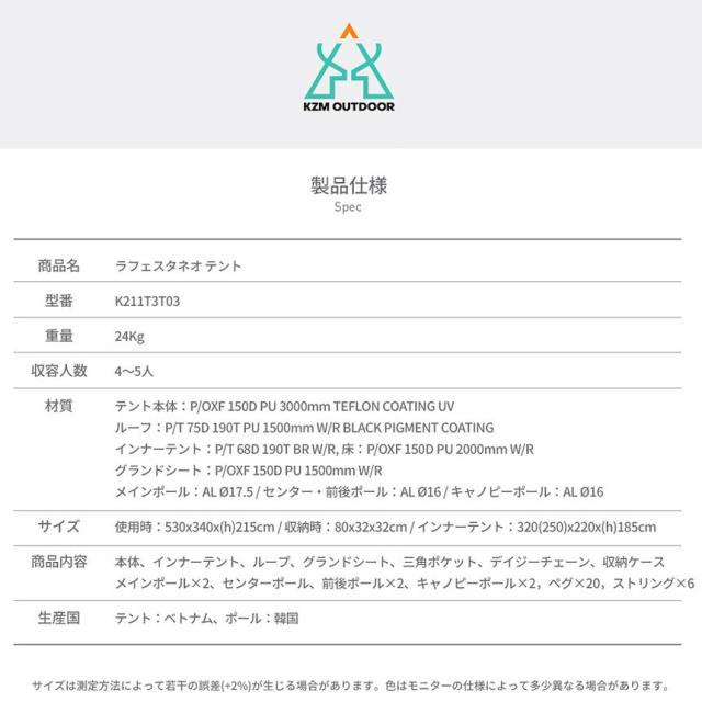 【新品】KZM テント ドーム型テント 大型テント 家族 ファミリーおしゃれ 4人用 5人用 アウトドア BBQ キャンプ用品 ラフェスタネオ(kzm-k211t3t03)