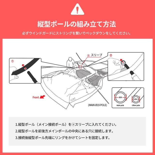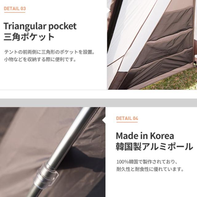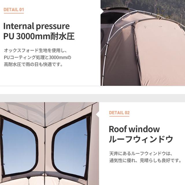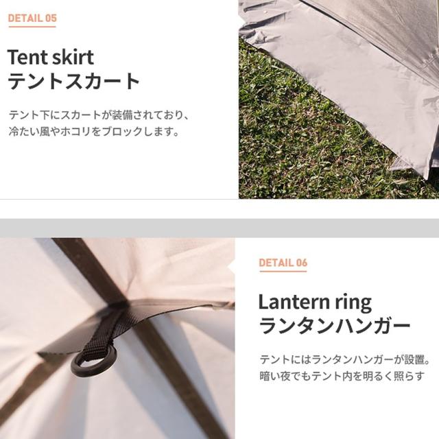 内容:テント本体、インナーテント、ルーフ、グランドシート、メインポール×2、センターポール、前・後面ポール×2、キャノピーポール×2、スチールペグ×20、ストリング×6、収納ケース