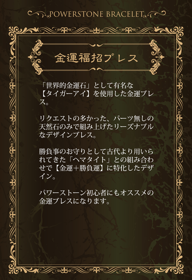 勝負事のお守りとして古代より用いられてきた「ヘマタイト」との組み合わせで、金運+勝負運に特化したデザイン。