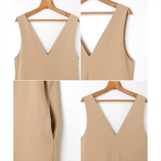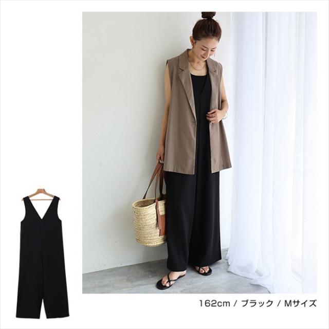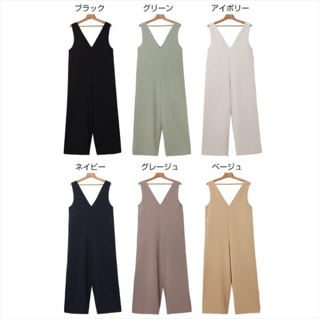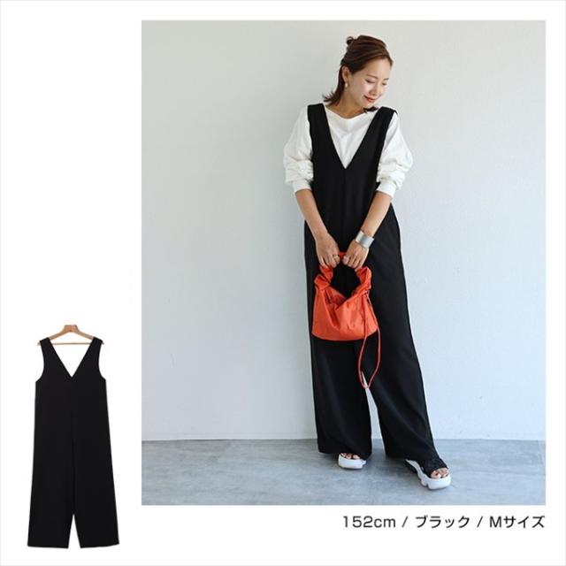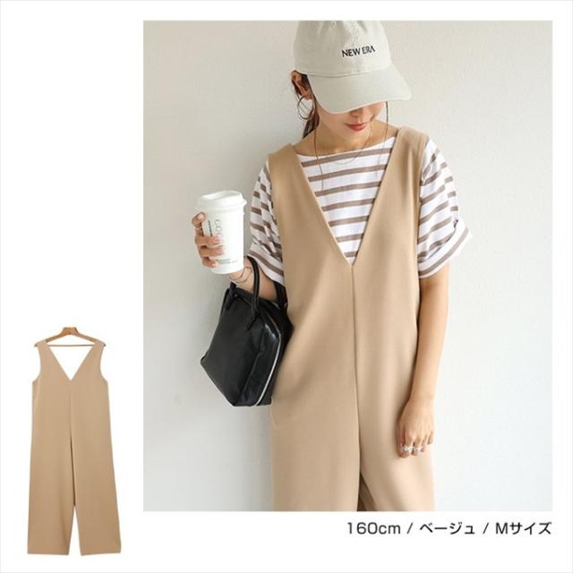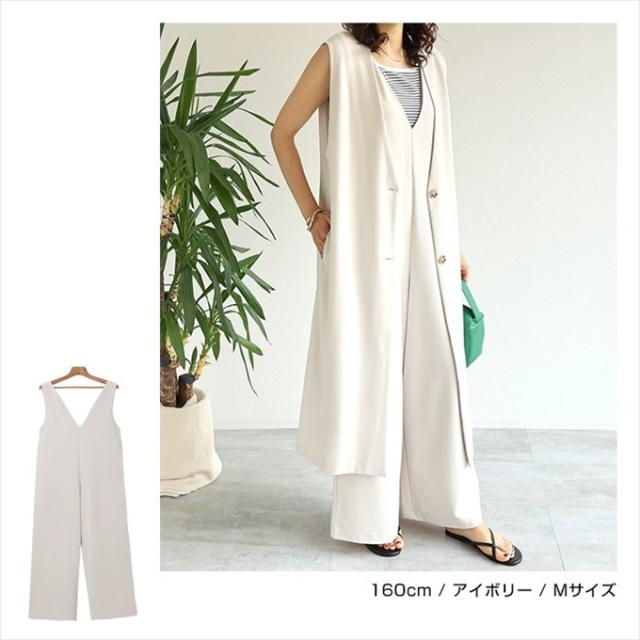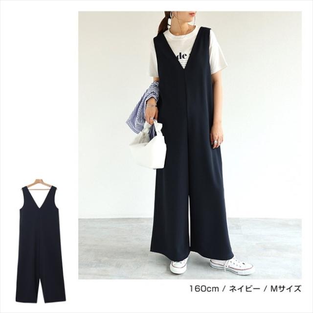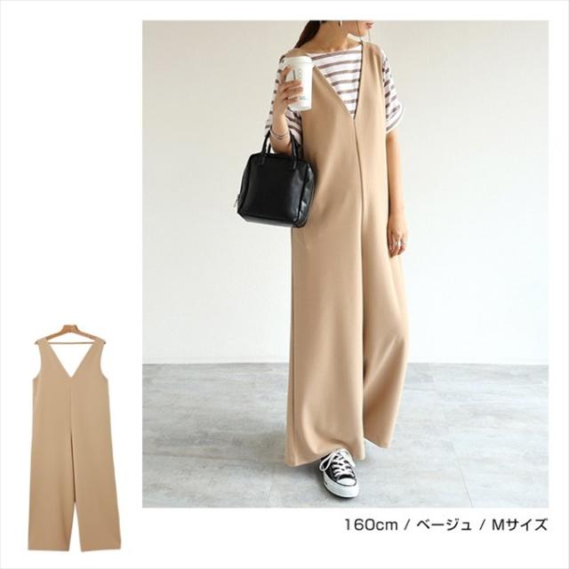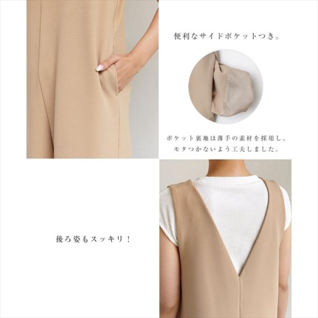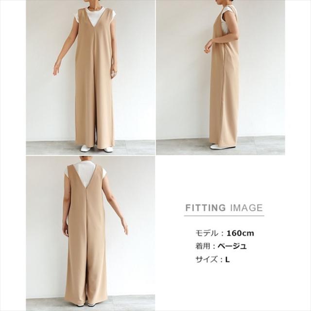 梨地ポンチ Vネック サロペット オールインワン レディース オケージョン オフィスウェア ストレッチ サイドポケット キレイめ 美ライン シンプル 無地 ボトム ワイド おしゃれ かわいい 大人 ファッション きれいめ ゆったり オフィス カジュアル ナチュラル 春夏 秋冬 M L