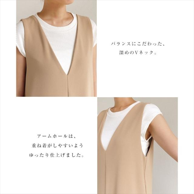 着まわしやすい深Vネックに、体のラインを拾いにくい、ストンと落ちるシルエット。