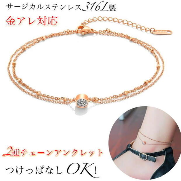 新作 サージカルステンレス アンクレット 2連チェーン 1粒 CZダイヤ(キュービック・ジルコニア)アンクレット つけっぱなし アレルギー対応 k18 ピンクゴールド ステンレス チェーン アンクレット 大人 永遠の魅力 ご褒美 カジュアル かわいい おしゃれ プレゼント