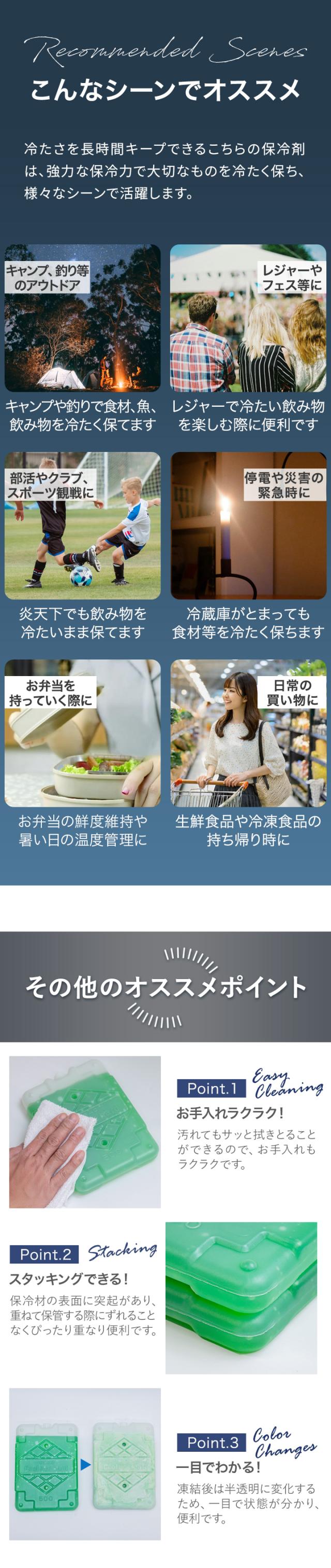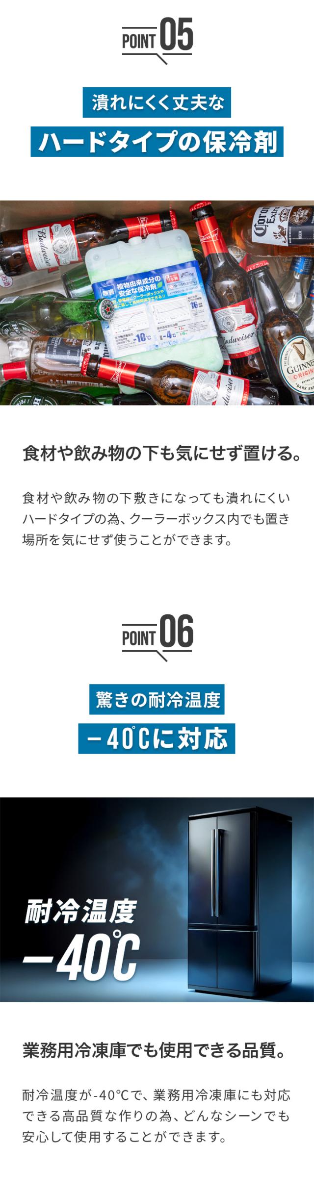| 特記事項: ※キャップは絶対に開栓しないで下さい。 ※ラベルは使用していく中で剥がれてしまいます。ご了承ください。 ※十分な保冷力を発揮させるために、冷凍庫で完全に凍らせてからご使用ください。(耐冷・耐熱温度-40〜50度) ※本製品を完全に凍らせるには冷凍庫で8〜12時間(庫内の設定温度による)入れて置く必要があります。 ※完全に凍らせるまでの時間は冷凍庫の温度設定や性能により異なります。 ※冷凍庫の温度設定を最大にしても凍らない場合には庫内温度を下げるため、霜取りや他のものを取り除いて下さい。 ※6リットルのクーラーボックスで本保冷剤1つが目安となります。 ※保冷力はクーラーボックスの性能やふたの開け閉めの頻度により異なります。 ※内側がアルミ蒸着のクーラーボックスに入れて使用しないでください。アルミ蒸着が剥がれる場合があります。 |