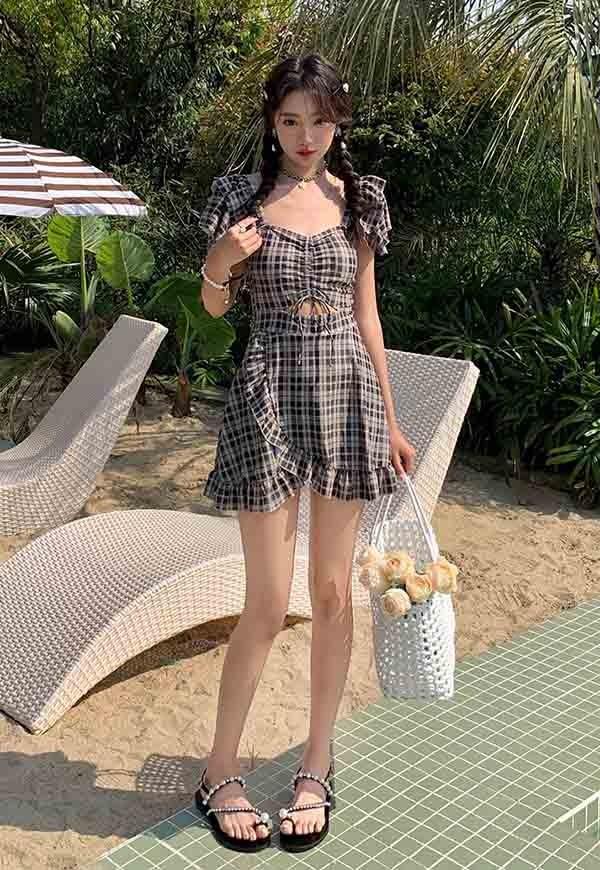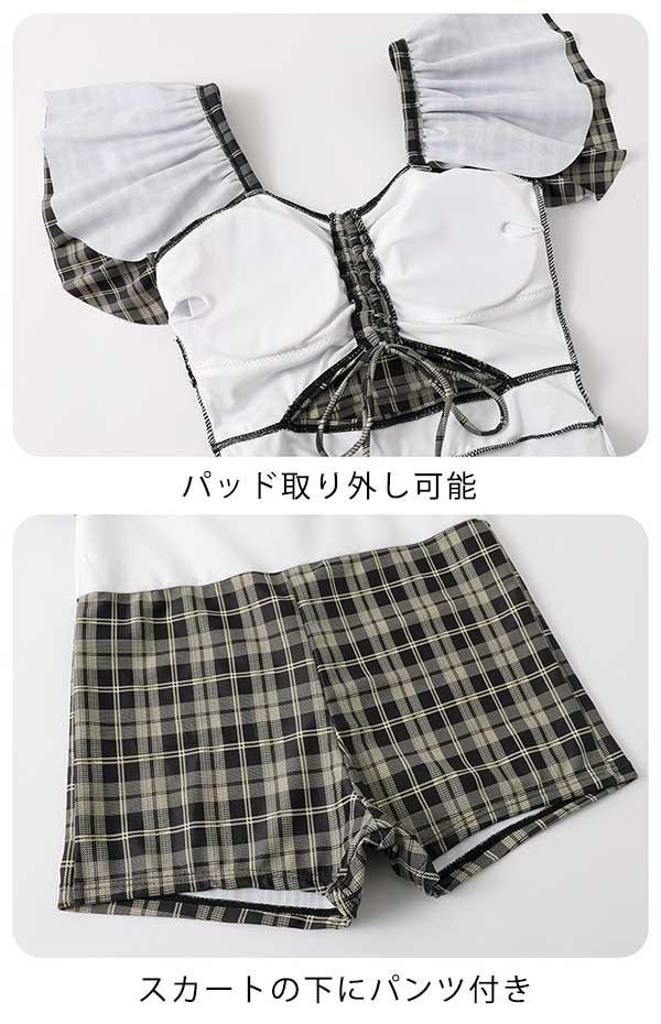 ワンピース水着 フリルショルダー エンジェルスリーブ カットアウト ギンガムチェック柄 レディース 韓国 ガール 可愛い 袖付き 痩せ見え 体型カバー 花柄 温泉 ビーチ プール 海 水泳 セクシー オトナ女子 かわいい 黒 ブラック df177n1n1c9
