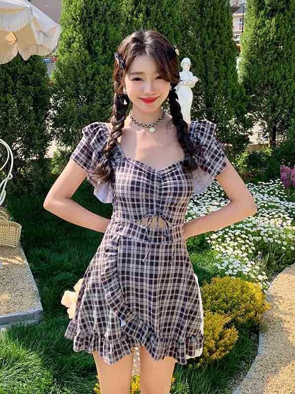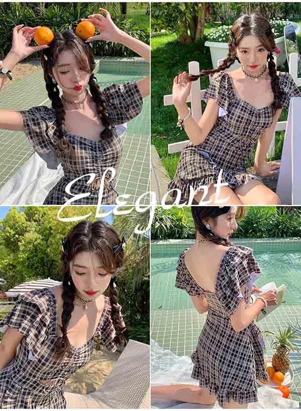 ワンピース水着 フリルショルダー エンジェルスリーブ カットアウト ギンガムチェック柄 レディース 韓国 ガール 可愛い 袖付き 痩せ見え 体型カバー 花柄 温泉 ビーチ プール 海 水泳 セクシー オトナ女子 かわいい 黒 ブラック