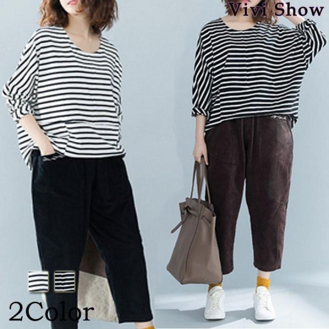 カットソー レディース ボーダー Uネック 長袖 トップス ロンT ゆったり 体型カバー カジュアル