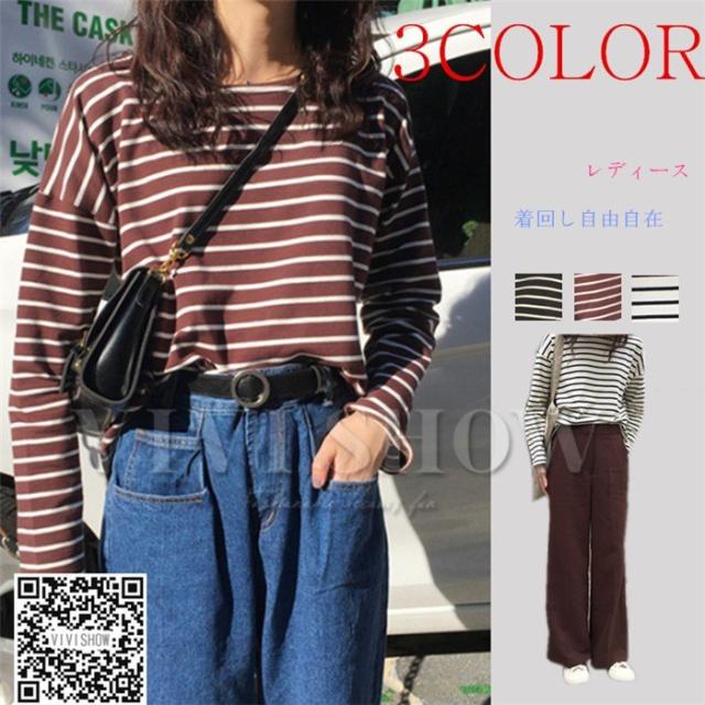 レディース Tシャツ ボーダー ゆったり 長袖 カジュアル ロンT トップス カットソー vivishow