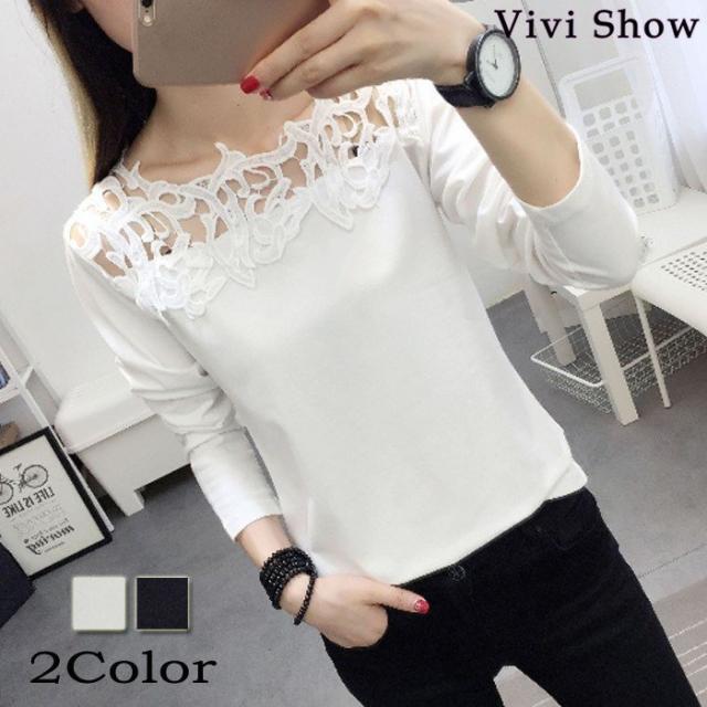 Tシャツ 長袖 レディース クールネックTシャツ 刺繍レース 着やせ カジュアル 薄手 トップス カジュアル ナチュラル