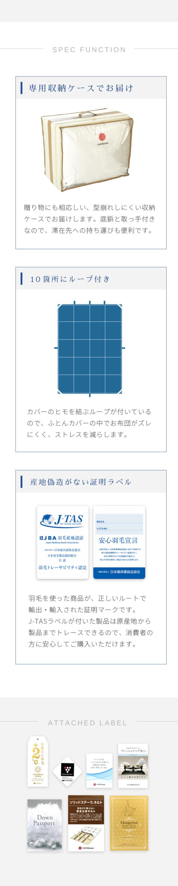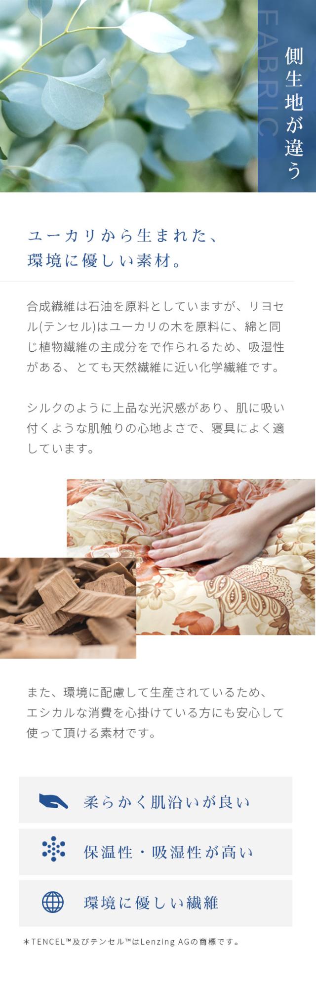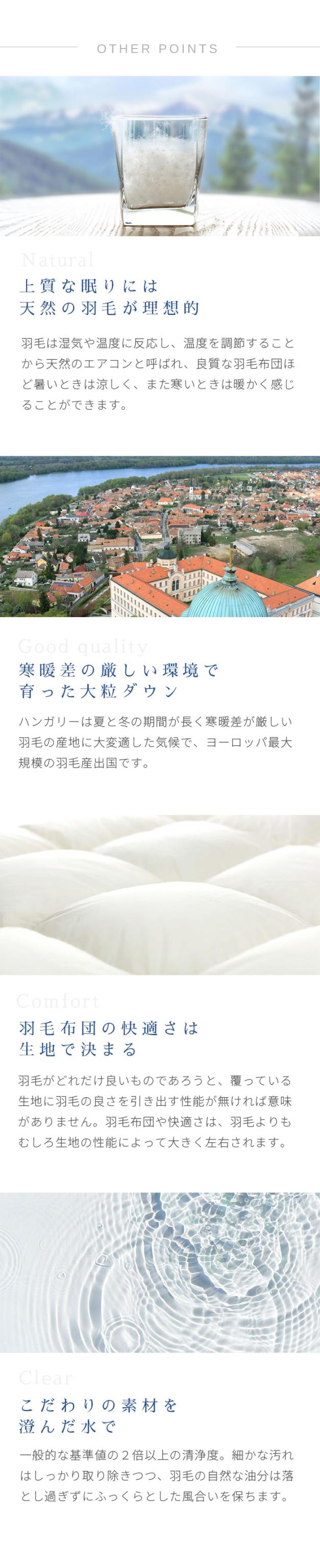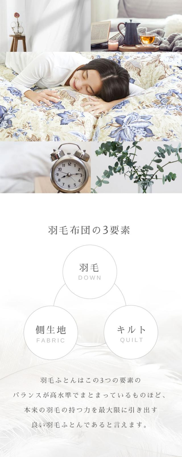 | 【西川独自の完全立体キルト】 通常の羽毛布団のキルティングでは直線的な格子状のマス目ですが、西川独自の「スーパーボディラインキルト」(特殊完全立体キルト)は、文字通り、ボディラインを描いています。肌面のキルトがお椀型なので肩口にも隙間が出来にくく、体に沿うようにフィットし、暖かさを閉じ込めます。 【フレッシュアップ加工】 羽毛本来のちからを目覚めさせる西川独自の「フレッシュアップ加工」。羽毛を高温スチームでさらにふっくらさせ、その中からより良質な羽毛を選びだすことによって、空気の掴む力が上がり、保温力の高い上質な羽毛に仕上がります。加工前の羽毛と比べて、約2℃に相当する保温力が向上することが証明されました。 【マザーグースダウン95%】 マザーダウンは、長期間飼育された親鳥の羽毛です。親鳥たちは寒い冬を越すために、身体のダウンがふんわりと 大きく成熟します。大きなダウンボールはより沢山の空気を 含む事ができるので、抜群の保温力を誇ります。より暖かい羽毛布団をお求めの方に、是非選んでいただきたい高品質なダウンです。 【手選別(ハンドセレクト)】 通常の採取方法で得られた羽毛から、さらに人の手によってピンセットで一粒ずつ厳選された良質なダウンを選別します。手作業ゆえにホコリも少なく、大粒のダウンボールのみが得られるので、手の込んだ作業に見合っただけの保温性に優れた高品質のお布団になります。 【リヨセル使用生地】 シルクのような上品な光沢感と綿の1.5倍の吸湿性があり、水分率が高くしっとりと肌に吸い付くような手触りです。ユーカリの木を原料としているため限りなく天然繊維に近く、環境に配慮された地球にも優しいサステナブルな繊維です。 |