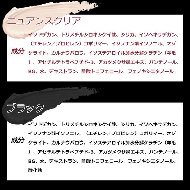 成分:イソドデカン、トリメチルシロキシケイ酸、シリカ、イソヘキサデカン、(エチレン/プロピレン)コポリマー、イソノナン酸イソノニル、オゾケライト、カルナウバロウ、イソステアロイル加水分解ケラチン(羊毛)、アセチルテトラペプチド-3、アカツメクサ鼻エキス、パンテノール、BG、水、デキストラン、酢酸トコフェロール、フェノキシエタノール