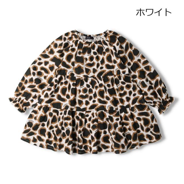 レオパード、ヒョウ柄のフレアーなシルエットのティアードデザインのワンピース。1枚で軽く着てもいいし、インナーにハイネックを合わせてもOK!長く使えるアイテムです。【アイテム】長袖 ロングスリーブ トップス シンプル ガーリー フェミニン カジュアル お洒落 オシャレ かわいい 可愛い 普段着 デイリーウェア お出かけ着 お外着 お外遊び着 子ども こども 女児 女の子 ガールズ キッズ ベビーサイズ トドラーサイズ 幼稚園 保育園 小学校 通園 通学 小学生 2022年秋冬物新作 丸高衣料 ホワイト 白色 ブラウン 茶色 ひょう柄 コットン100% 綿100%