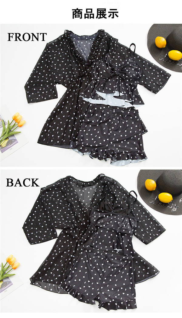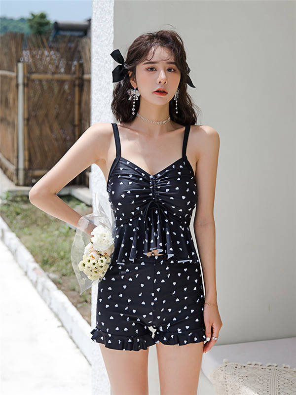 水着 レディース 2点セット タンキニ アンダーフレア フレア 体型カバー 露出控え ビスチェ ショートパンツ トップス 袖あり 長袖 透け感 かわいい フリル ハイウエスト ブラック ドット柄 df056x2x2la