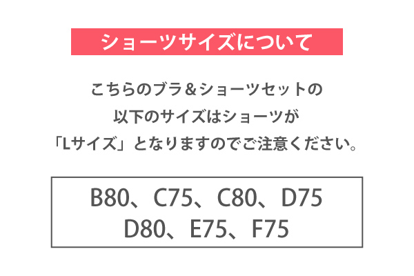 A70 A75 B65 B70 B75 B80 C65 C70 C75 C80 D65 D70 D75 D80 E65 E70 E75 F65 F70 F75 ショーツ:Mサイズ ヒップ 87-95cm/Lサイズ ヒップ 92-100cm ※以下のサイズはショーツがLサイズになります。 B80/C75/C80/D75/D80/E75/F75 |