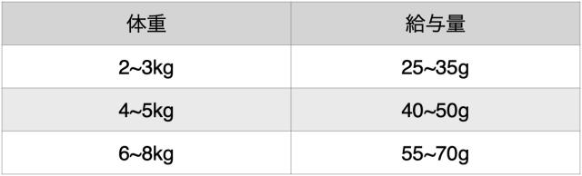 ・1日の給与量は表を参考に、猫種・年齢・活動量に応じて調節してください。