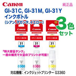 【純正品 カラー3色セット】 Canon/キヤノン GI-31C, GI-31M, GI-31Y インクボトル 新品 (G3360, G3370, G3390, G1330 対応)