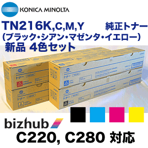 【4色セット】コニカミノルタ TN216K, C,M,Y (黒・青・赤・黄)国内純正トナー・新品(カラー複合機 bizhub C220 , bizhub C280 対応)