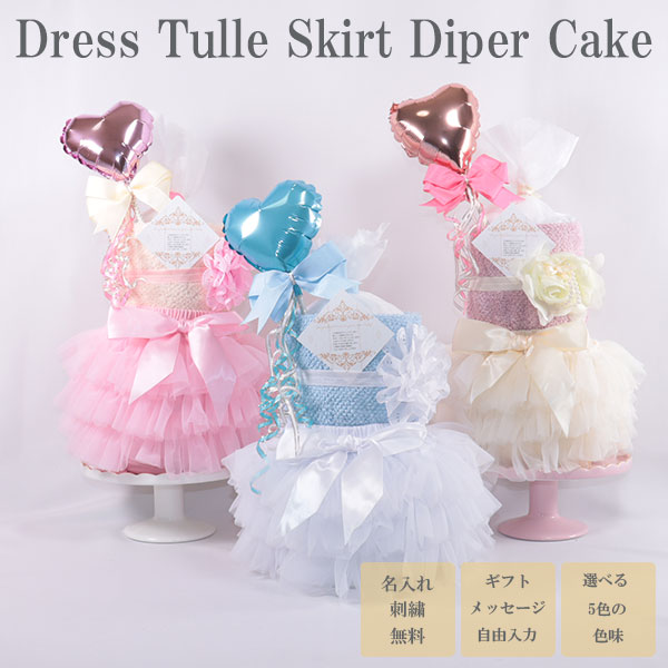 おむつケーキ ドレス 出産祝い チュールスカート 名入れ刺繍 ダイパーケーキ 誕生日祝い ベビーシャワー