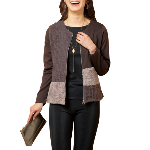 ノーカラージャケット ブラウン ニット ファー レディース 異素材切替ジャケット アウター ブルゾン 婦人服 ミセス シニア 茶系 カジュアルジャケット おしゃれ 茶色 前ファスナー ジップアップジャケット かわいい シニアファッション 40代 50代 60代 70代 80代 母の日 お母さん おばあちゃん 敬老の日 秋冬