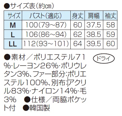 ●素材/ポリエステル71%・レーヨン26%・ポリウレタン3%、ファー部分:ポリエステル100%、別布:アクリ