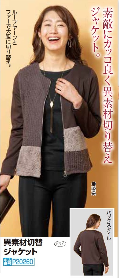 ノーカラージャケット ブラウン ニット ファー レディース 異素材切替ジャケット アウター ブルゾン 婦人服 ミセス シニア 茶系 おしゃれ 茶色 前ファスナー ジップアップジャケット かわいい シニアファッション 50代 60代 70代 80代 母の日 お母さん 秋冬 fri p20260