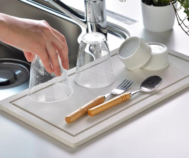 モイストレイは洗い物から落ちた水滴をサッと吸収し、徐々に空気中に放出してくれます。水が溜まらないのでシンクに流す手間が省ける上、水垢やぬめりが付く心配もなく、お手入れが簡単です。