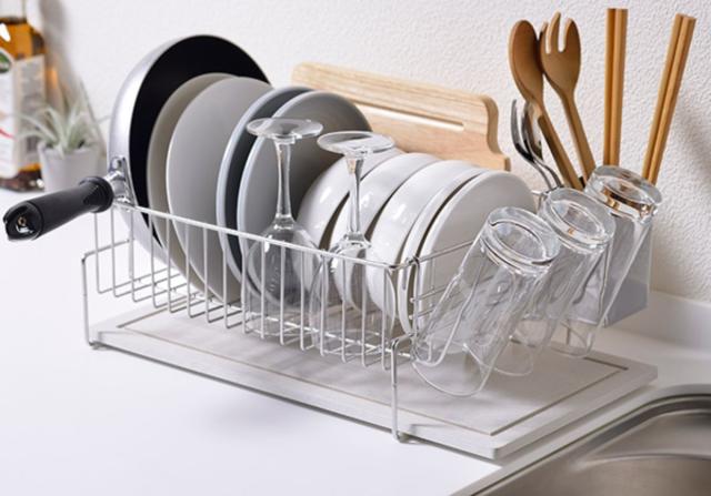 専用の水切りラックがなくても、シンク横などに置いて洗った物をのせるだけで乾かせます。