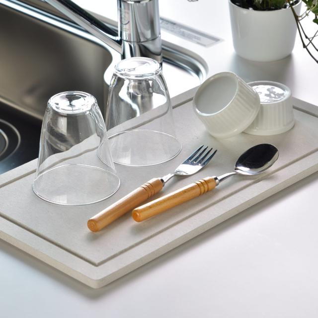 モイストレイは洗い物から落ちた水滴をサッと吸収し、徐々に空気中に放出してくれます。水が溜まらないのでシンクに流す手間が省ける上、水垢やぬめりが付く心配もなく、お手入れが簡単です。