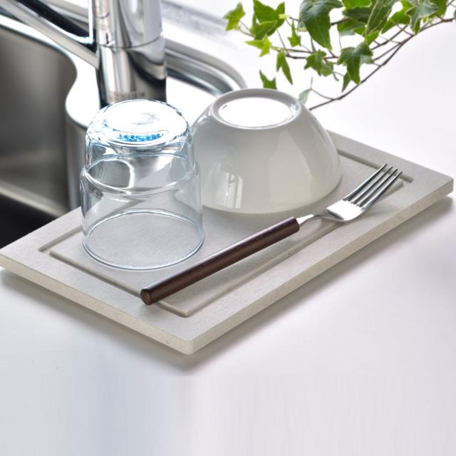 モイストレイは洗い物から落ちた水滴をサッと吸収し、徐々に空気中に放出してくれます。水が溜まらないのでシンクに流す手間が省ける上、水垢やぬめりが付く心配もなく、お手入れが簡単です。