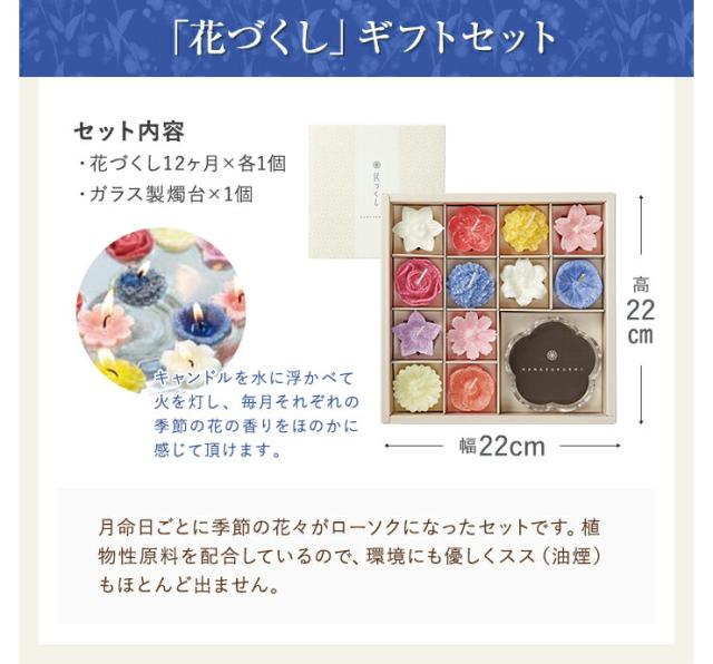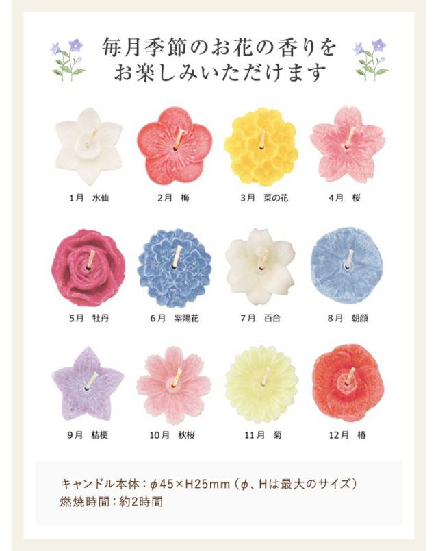 ・花づくし:お花のキャンドル(水仙、梅、菜の花、桜、牡丹、紫陽花、百合、朝顔、桔梗、秋桜、菊、椿)各1個、ガラス製燭台1個