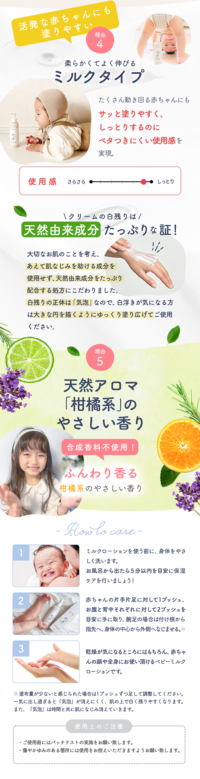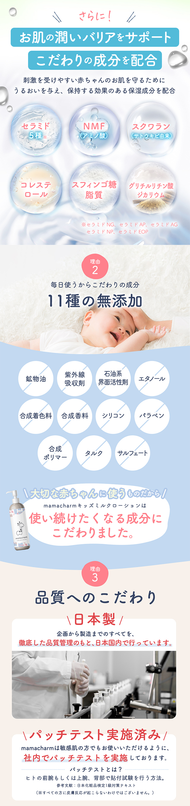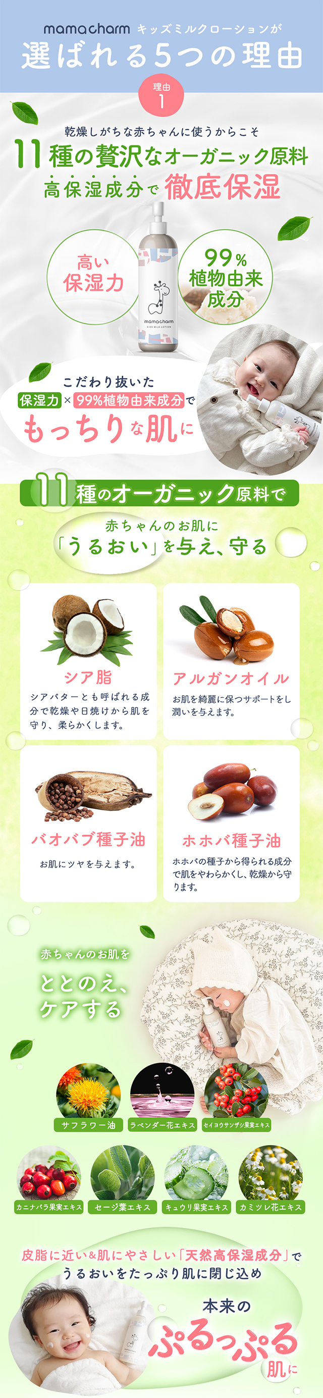 | 商品特徴 | 「オーガニック保湿成分」「11種の無添加」「日本製」にこだわった、赤ちゃんの乾燥保湿用、ミルクローション誕生! |