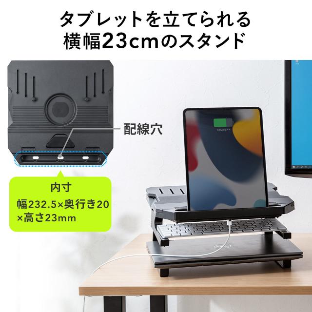 ●前面にはタブレットを設置できる、幅23cmのスタンド付きです。