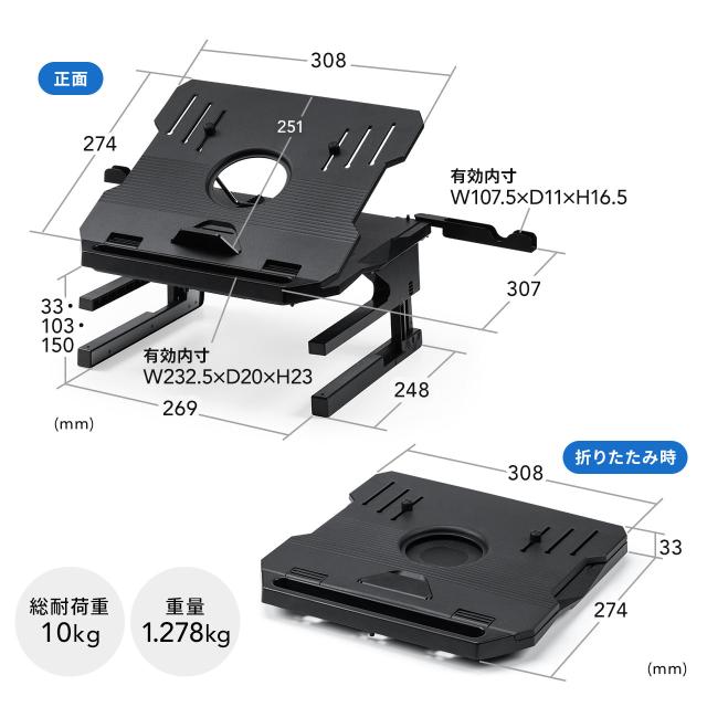 ■対応サイズ:幅30×奥行き25cm以内に脚があり、10kgまでのノートパソコン。取扱説明書