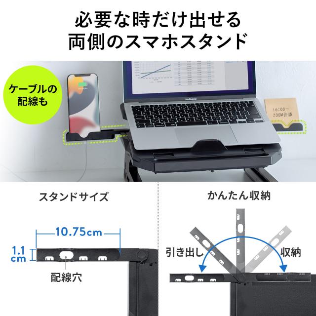 ●側面後ろにはそれぞれ、収納可能なスマートフォンスタンドが付いておりノートPCと並べて立てることができます。