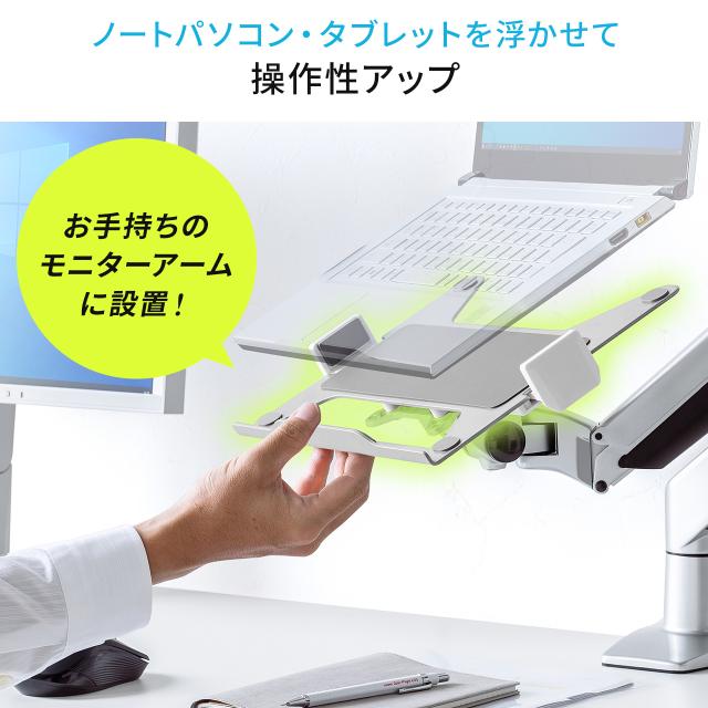 ⇒ご購入の前にご確認下さいモニタアームに設置できる、横幅29〜46cmに対応できるノートパソコントレー/ノートパソコンホルダー。モバイルモニターやタブレットの設置も可能なバネ式のVESA75×75対応のホルダー。【WEB限定商品】