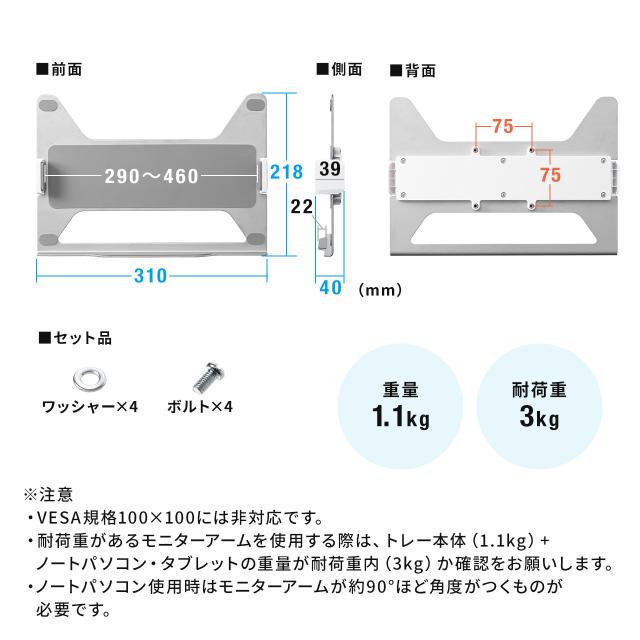 ●モニタアームに取り付け、ノートパソコンやタブレット等を設置できるノートパソコントレーです。●VESA75×75に対応したモニタアームに設置可能です。