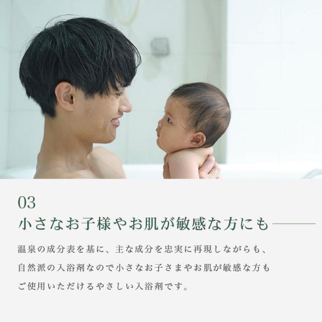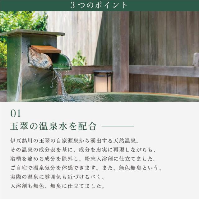 【毎日が温泉気分】保湿美肌温泉と称される日本の名湯、伊豆熱川の玉翠の温泉成分表をベースに製造した、粉末入浴剤です。実際の温泉に雰囲気も近づけるべく、入浴剤も無色、無臭に仕立てました