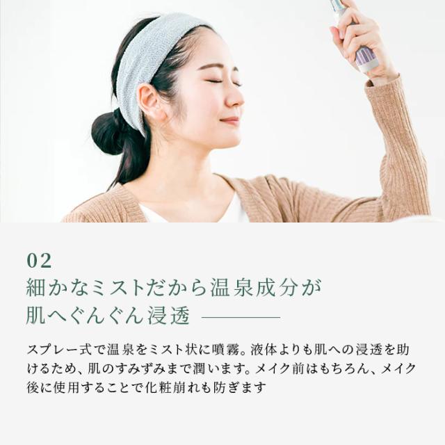 【オーガニック化粧水スプレー式 温泉配合】自家源泉からの温泉を100%配合した、オーガニック化粧水です。スプレー式で温泉をミスト状に噴霧するので、温泉化粧水が肌に浸透するのをよりサポートします