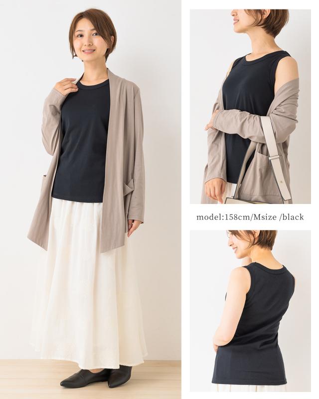 | 商品詳細/その他 | 主役にもインナーにも使えるベーシックタンクトップ。おしりも隠れる絶妙丈でレイヤードにも最適です。肌触りがよく伸縮性に優れたコットン生地を使用。コーマ糸という毛羽たちが少なくソフトな肌触りの繊維を使用してるので着用感も抜群!年中使えるベーシックアイテムです。 |