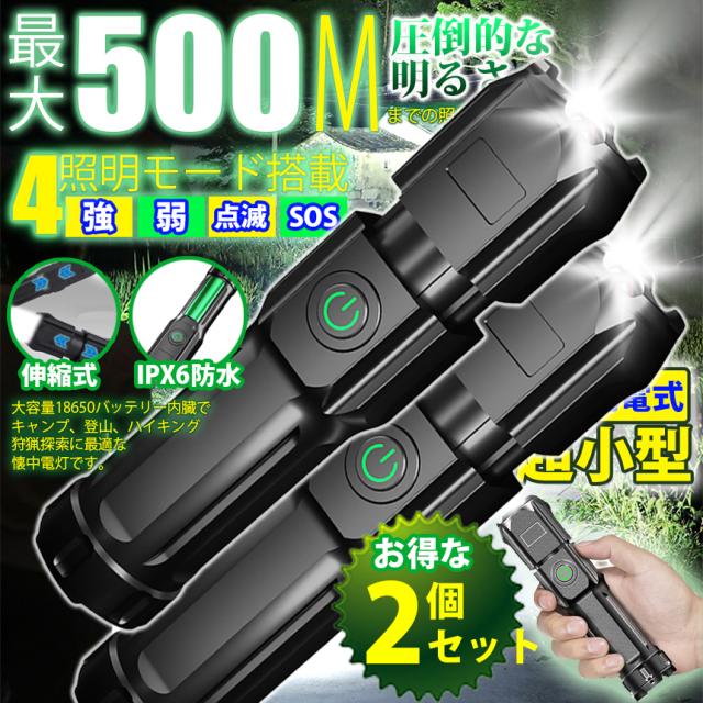 懐中電灯 2個セット ズーミングライト 4モード 点灯 強力照射 USB充電式 爆光 マルチ ハンディライト 照明 LEDライト 超小型ランプ 緊急 災害 500m 照射